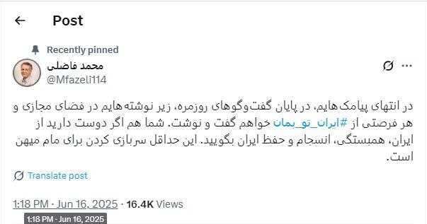 ایرنا/ محمد فاضلی نوشت: در انتهای پیامکهایم، در پایان گفتوگوهای روزمره، زیر نوشتههایم در فضای مجازی و هر فرصتی از «ایران تو بمان» خواهم گفت و نوشت.