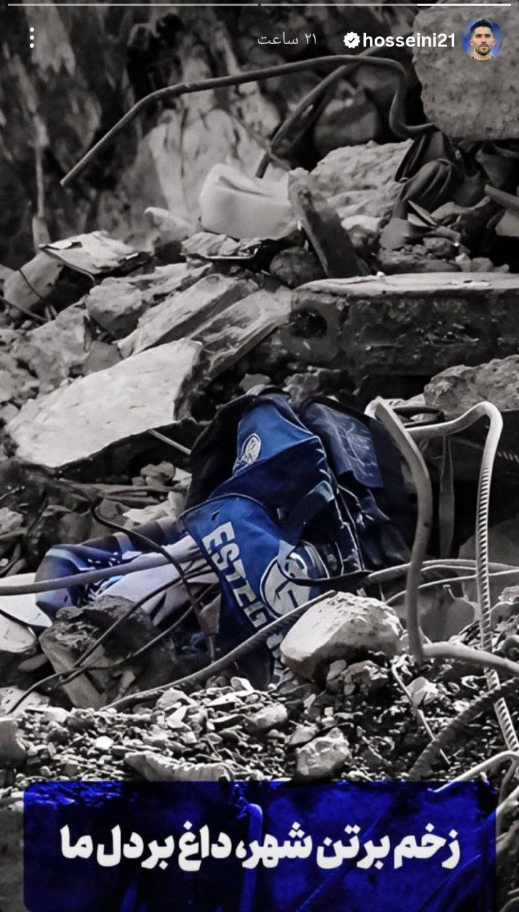 در یکی از دردناک ترین تصاویر برای اهالی فوتبال، پیدا شدن کیف ورزشی با طرح و نام تیم استقلال در زیر آوارهای ناشی از حملات ناجوانمردانه، احساسات و واکنش فوتبال دوستان را یکبار دیگر برانگیخت. حالا سید حسین حسینی کاپیتان آبیها با بازنشر پوستری در همین خصوص با جمله "زخم بر تن شهر، داغ بر دل ما"، حملات صهیونیستی را محکوم کرده.