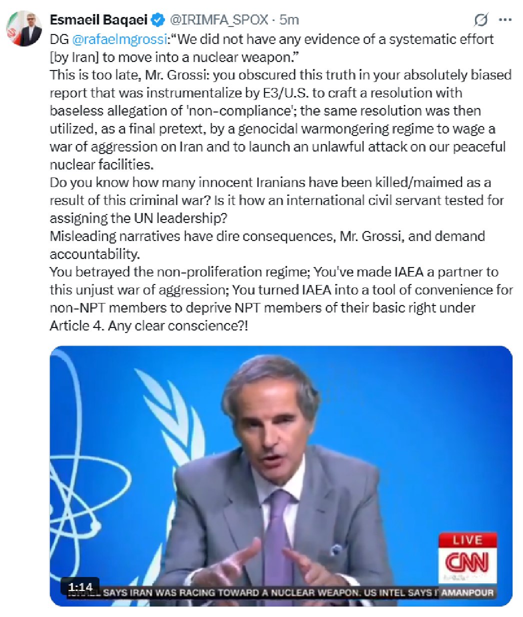 ایسنا/ سخنگوی وزارت امور خارجه در پیامی در شبکه ایکس خطاب به مدیرکل آژانس بینالمللی انرژی اتمی نوشت: آقای گروسی، شما به رژیم عدم اشاعه خیانت کردید؛ آژانس را به شریکی در این جنگ ناعادلانه تجاوزگرانه تبدیل کردید.