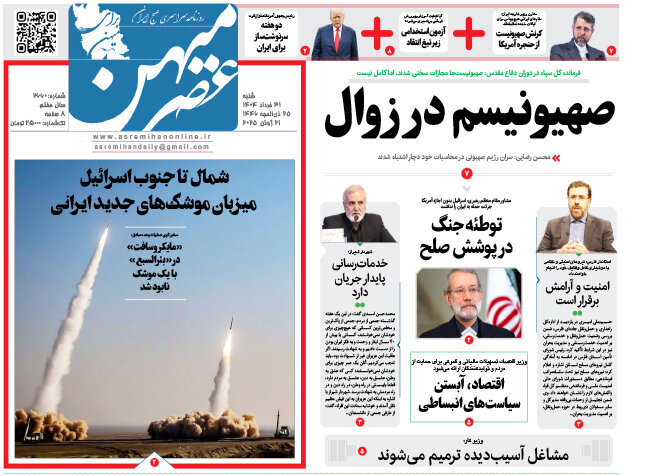 صفحه اول روزنامه آسیا شنبه ۷ تیر
