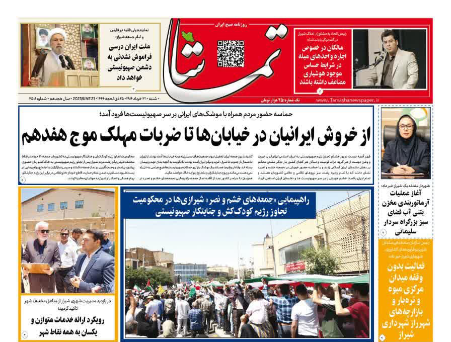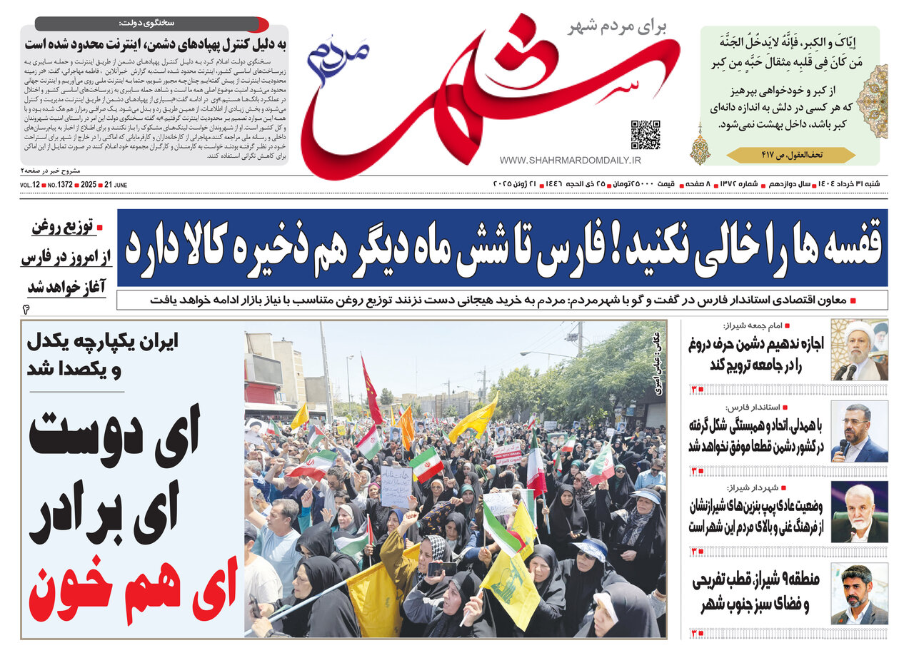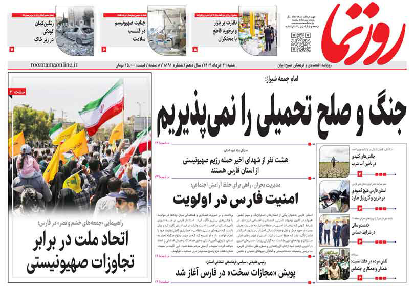 صفحه اول روزنامه امروز شنبه ۷ تیر