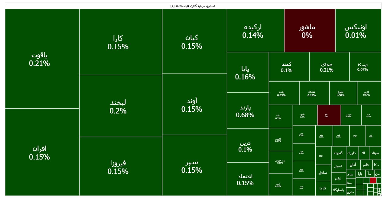 شایان ذکر است که امروز بورس اوراق بهادار ایران (بورس تهران و فرابورس ایران) روی هم رفته شاهد ۱۱۱ هزار و ۸۳۴ معامله مجموعاً به ارزش ۴۲ هزار و ۳۰۵ میلیارد تومان بود که سهم بخش صندوقهای سرمایهگذاری قابل معامله در بخش اوراق با درآمد ثابت از معاملات ۳۶ هزار و ۴۸۵ میلیارد تومان بود و ۵ هزار و ۸۲۰ میلیارد تومان دیگر نیز به معاملات اوراق تأمین مالی (اسناد خزانه و مرابحه عام دولت) اختصاص یافت.