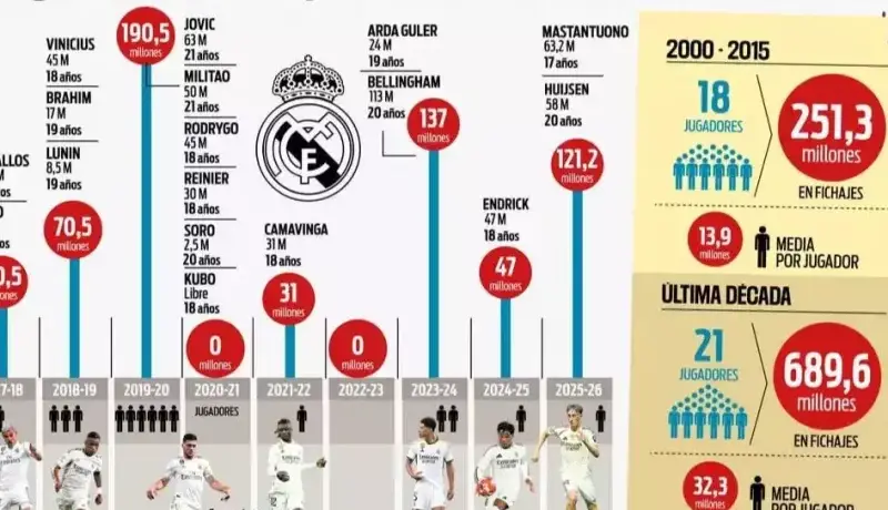 از سال ۲۰۰۰ تا ۲۰۱۵، رئال مادرید مبلغ ۲۵۱.۳ میلیون یورو برای بازیکنان جوان (۲۱ ساله یا کمتر) هزینه کرده است. این مبلغ بین ۱۸ بازیکن تقسیم شده که میانگین هر خرید را به ۱۳.۹ میلیون یورو میرساند. در این دوره، بازیکنانی مانند ایسکو (۳۰ میلیون یورو در ۲۱ سالگی)، بنزما (۳۵ میلیون در ۲۱ سالگی)، سرخیو راموس (۲۷ میلیون در ۱۹ سالگی) و مارسلو (۶.۵ میلیون در ۱۸ سالگی) به تیم پیوستند.