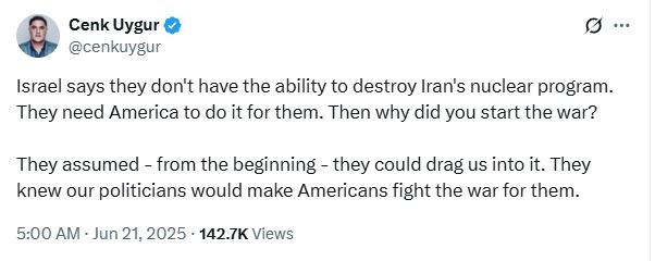 جماران/ سنک اویگور، مدیر شبکه TYT آمریکا: اسرائیل گفته که توانایی نابودی کامل برنامه هستهای ایران را ندارد و به آمریکا نیاز دارند تا این کار را برایشان انجام دهد.
