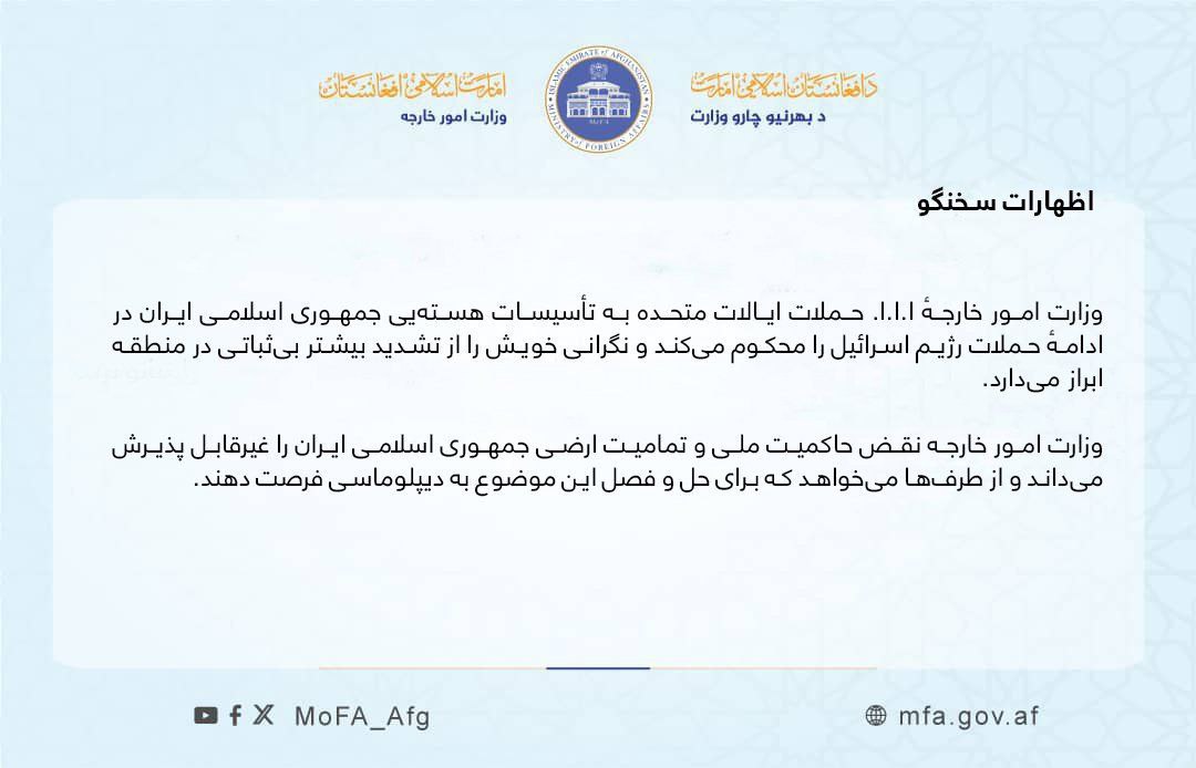 تسنیم/ وزارت خارجه حکومت طالبان با انتشار بیانیهای، حملات آمریکا به تأسیسات هستهای ایران را محکوم کرده و نسبت به گسترش بیثباتی در منطقه ابراز نگرانی کرده است.