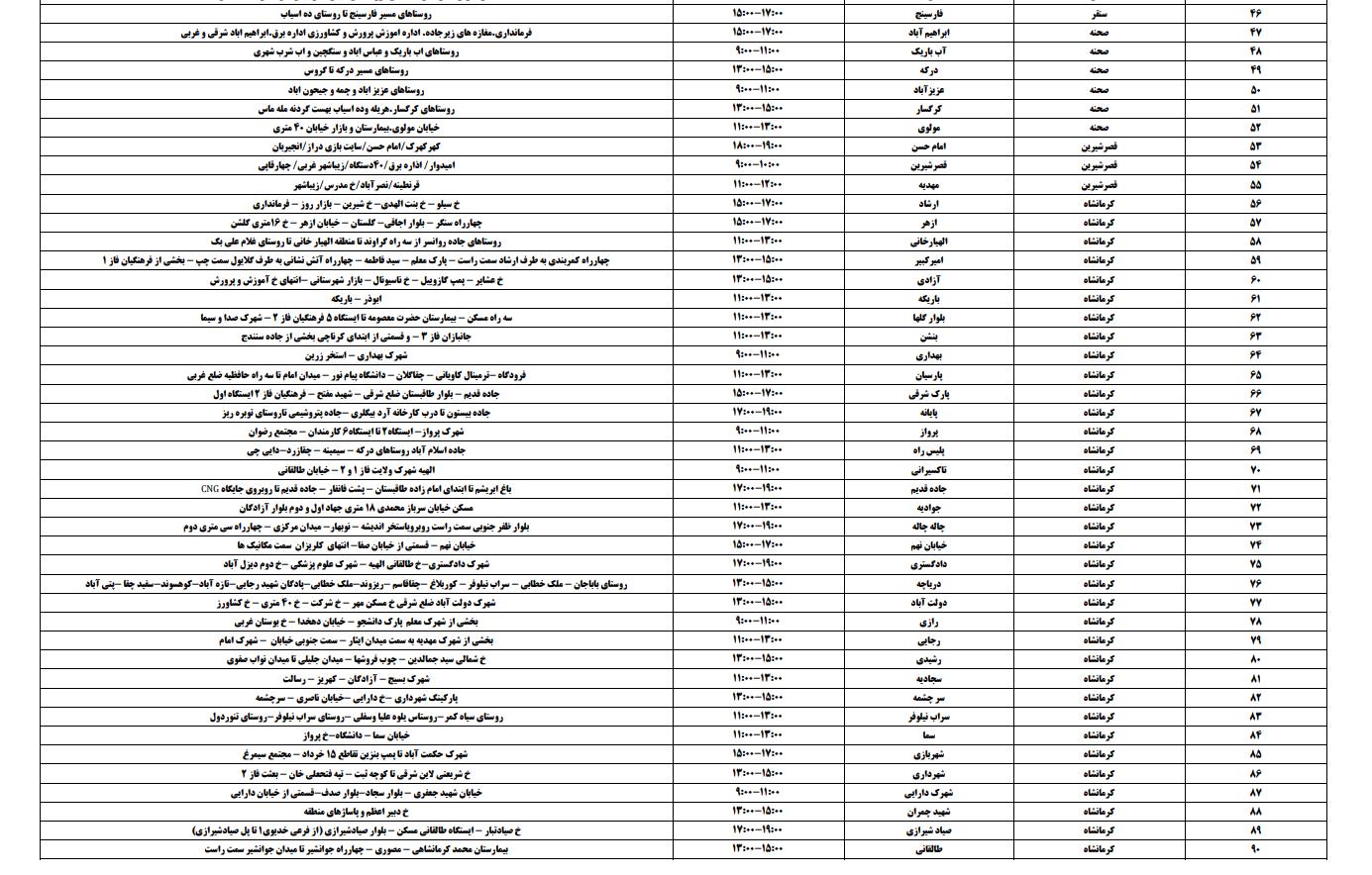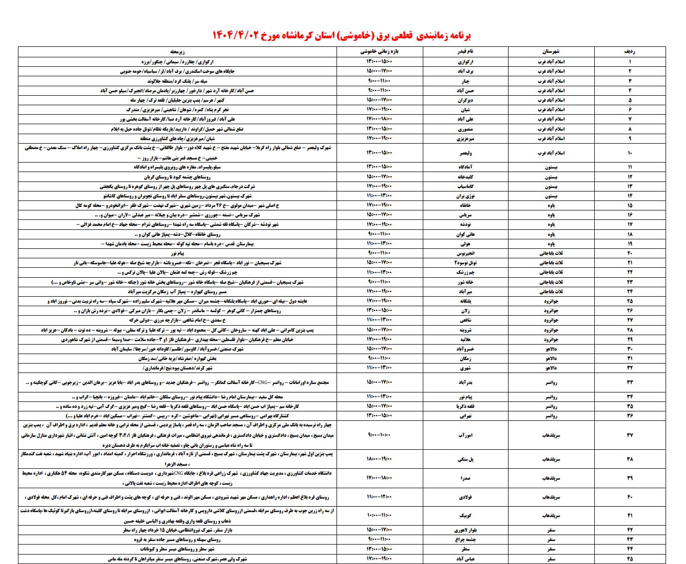 به اطلاع مشترکان شرکت توزیع نیروی برق کرمانشاه میرساند: با توجه به محدودیت فعالیت نیروگاهها و مطابق تصمیمات اتخاذ شده، ضمن تاکید بر صرفهجویی جدی در مصرف برق، مشترکان محترم شرکت توزیع نیروی استان کرمانشاه جهت اطلاع از زمان قطع برق در بخش خانگی و تجاری به جدول زیر مراجعه کنند.