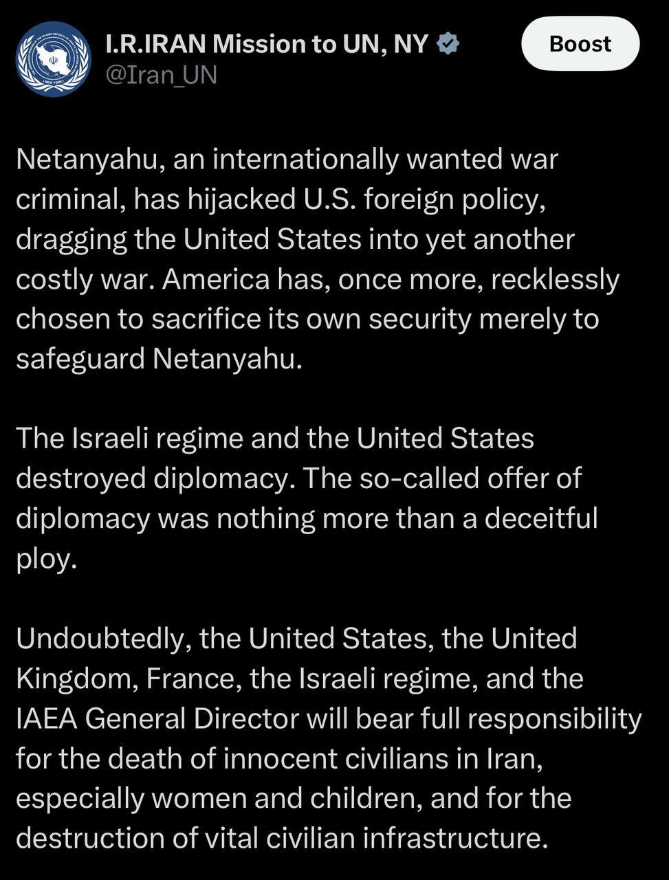 بدون تردید، ایالات متحده، انگلیس، فرانسه، رژیم اسرائیل و مدیرکل آژانس بینالمللی انرژی اتمی مسئول کامل جان باختن غیرنظامیان بیگناه در ایران، بهویژه زنان و کودکان، و همچنین ویرانی زیرساختهای حیاتی غیرنظامی خواهند بود.