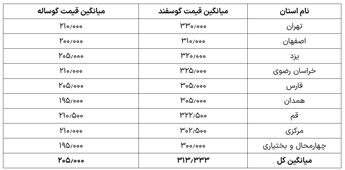 بیشترین قیمت ثبتشده برای گوسفند زنده متعلق به استان تهران است که در بازهای بین 325 هزار تومان و 335 هزار تومان نوسان دارد. پس از آن، خراسان رضوی و قم با قیمت 325 هزار تومان و 322 هزار و 500 تومان در رتبه دوم قرار گرفتهاند.