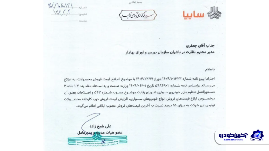 حال در این بین شاهد هستیم که گروه خودروسازی سایپا در دومین روز تابستان ۱۴۰۴، نامه ای را پیرو افزایش قیمت ۱۵ درصدی محصولات خود اعلام کرده است.
