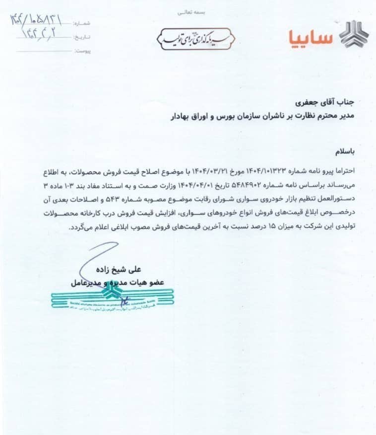 در این نامه که با امضای علی شیخزاده، عضو هیأتمدیره و مدیرعامل سایپا صادر شده، به استناد مصوبه شماره 543 شورای رقابت و دستورالعمل تنظیم بازار خودروی سواری، اصلاحات بعدی آن و نامه وزارت صمت به شماره 54890 مورخ 1404/03/01، افزایش قیمتها در راستای اجرای دستورالعملهای ابلاغی صورت گرفته است.