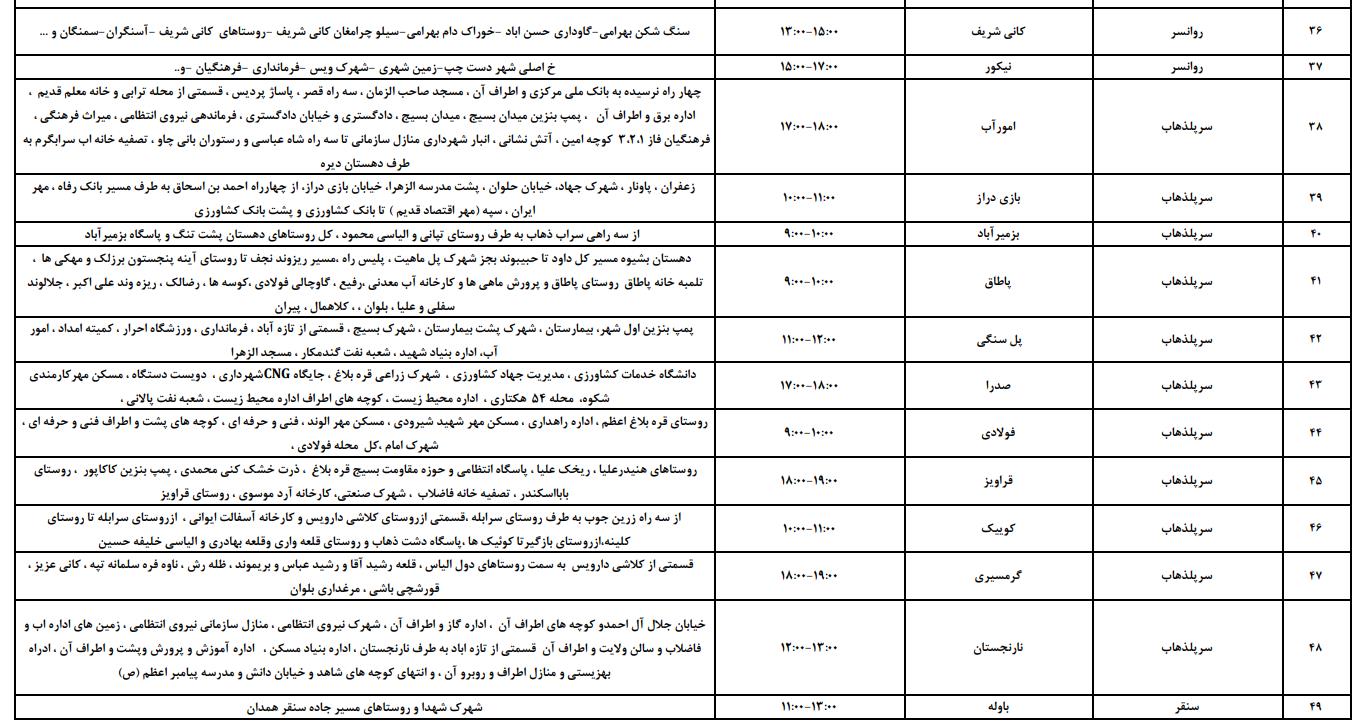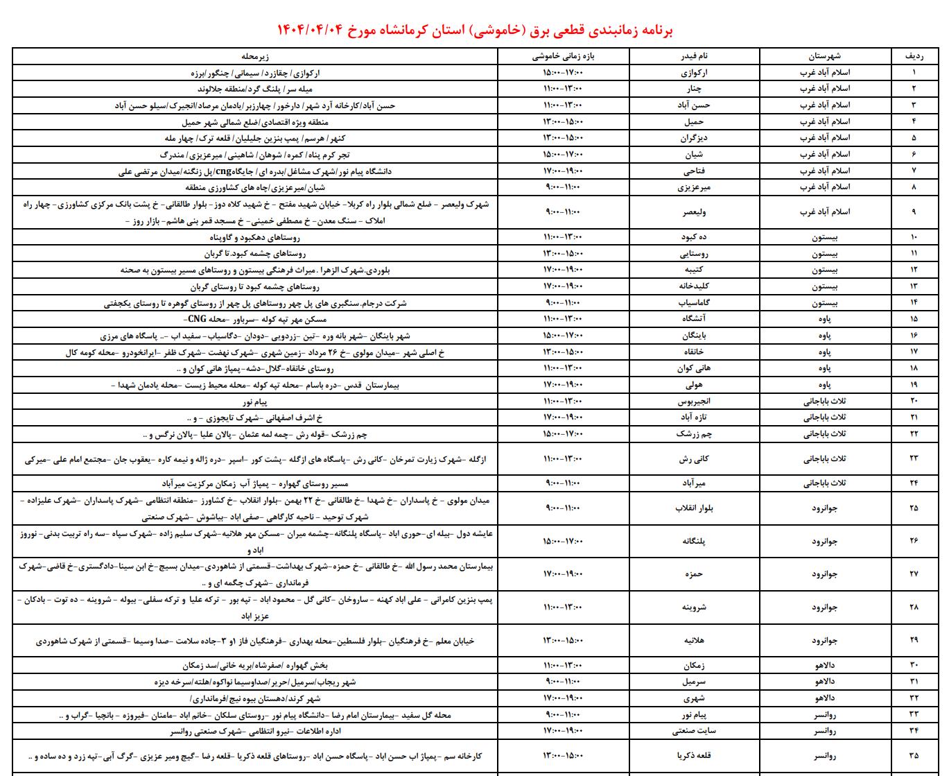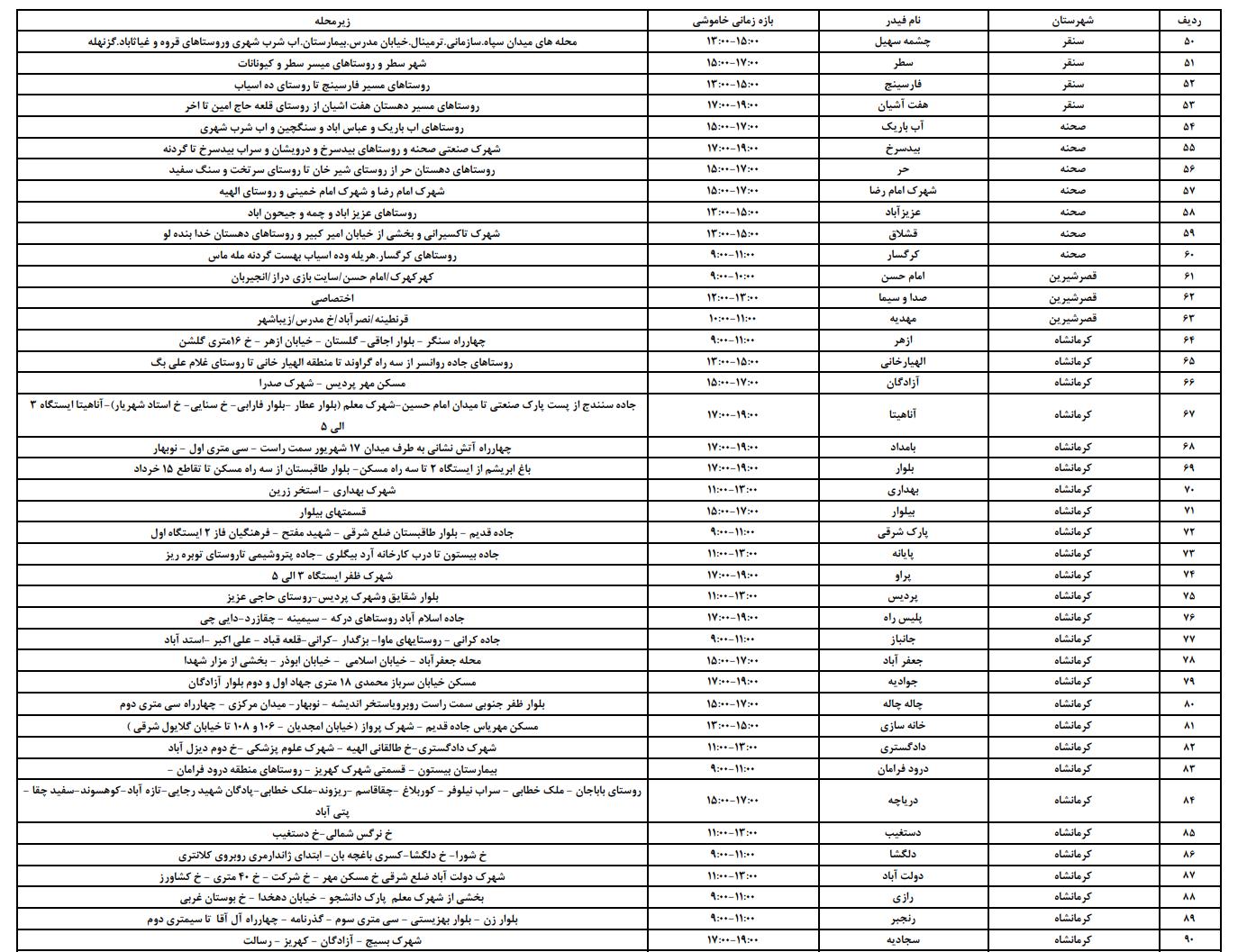 جدول زمانی قطع برق استان کرمانشاه در روز ۴ تیر