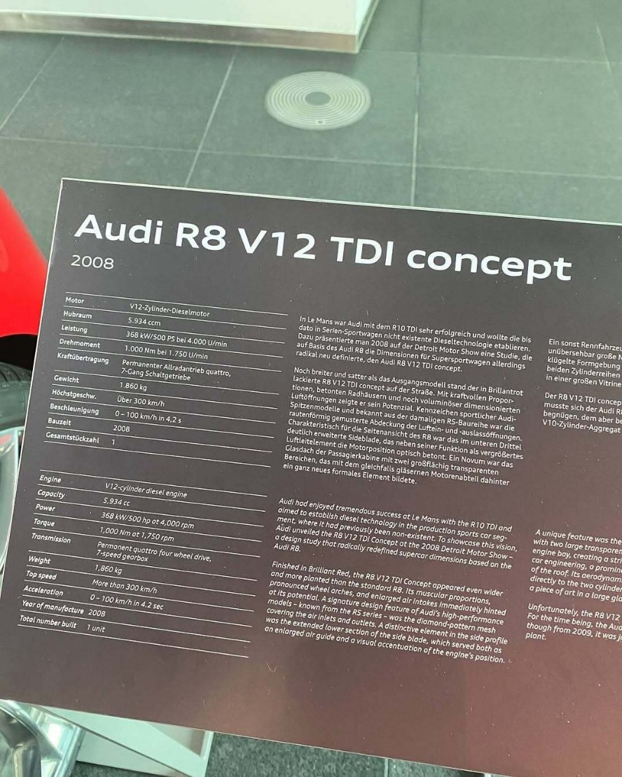 عصر ایران/ در سال ۲۰۰۸، آئودی دنیای خودرو را شگفتزده کرد و از کانسپت R8 V12 TDI رونمایی کرد؛ خودرویی با پیشرانه دیزلی که میراث مسابقات لمان را با عملکرد یک سوپراسپرت ترکیب میکرد. در زیر پوشش شیشهای پیشرانه، یک موتور ۶ لیتری V12 دوقلو توربو قرار داشت که از خودروی مسابقهای R10 LMP1 آئودی گرفته شده بود. این موتور توانایی تولید ۴۹۳ اسببخار قدرت و ۱۰۰۰ نیوتنمتر گشتاور را داشت.