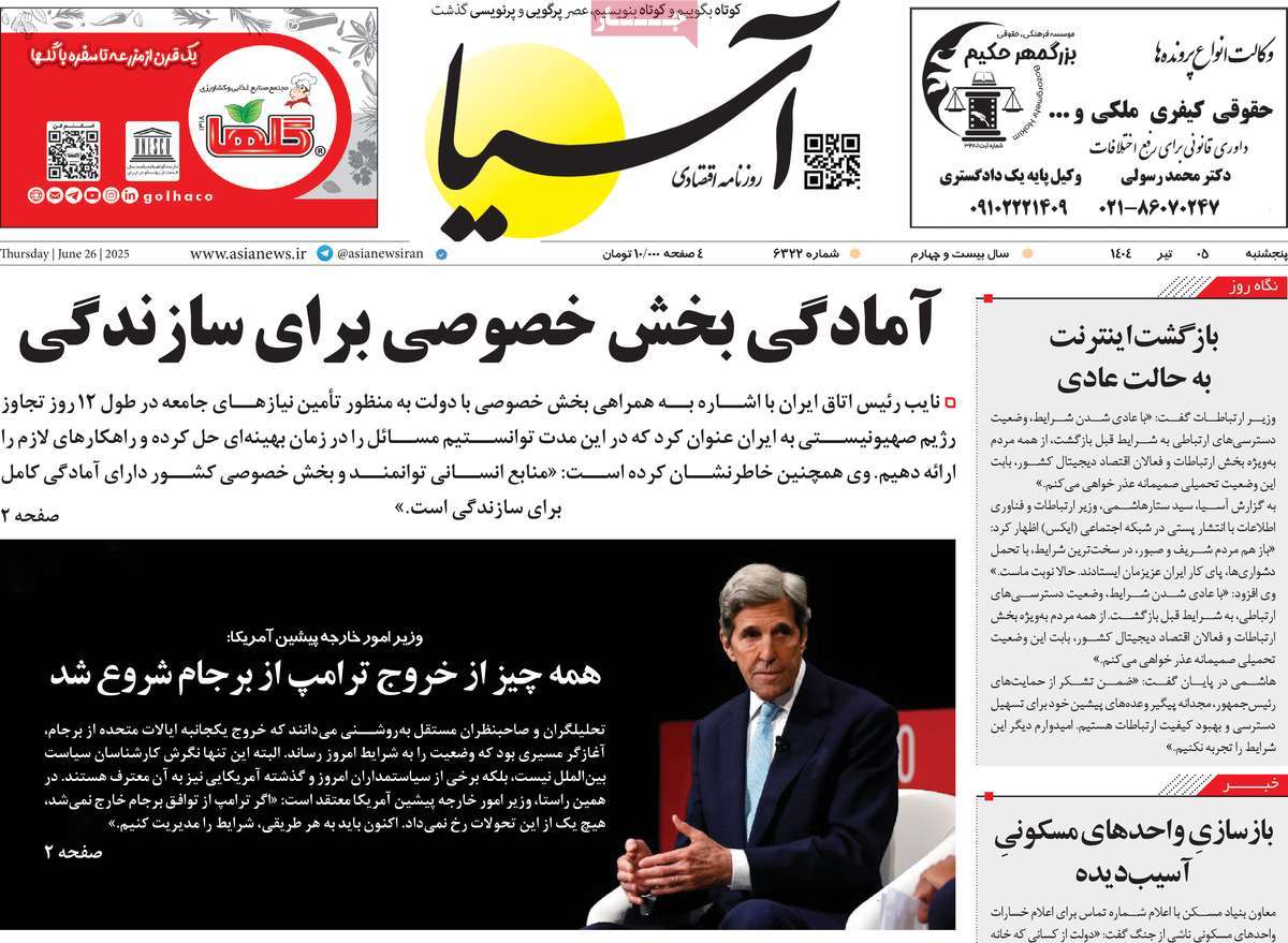 صفحه اول روزنامه آسیا پنجشنبه ۵ تیر