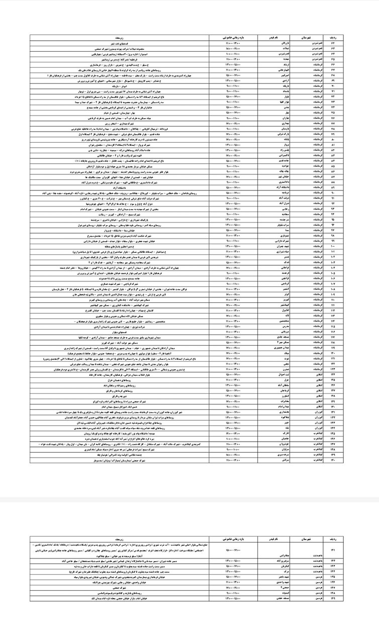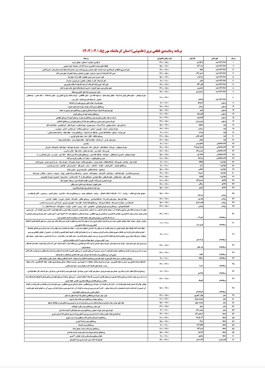 شرکت توزیع برق استان کرمانشاه طی جدولی، زمانبندی قطعی برق در مناطق مختلف استان کرمانشاه را برای امروز _ پنجشنبه پنجم تیر_ اعلام کرد.
