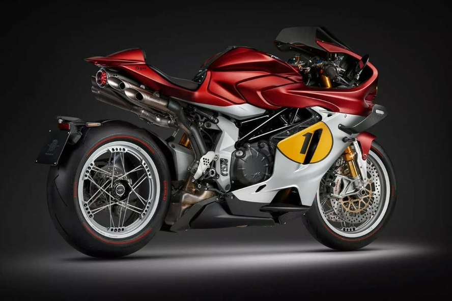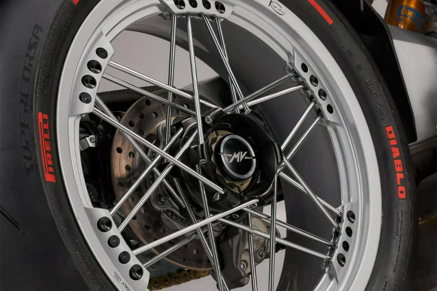 به همین دلیل، MV آگوستا تولید این مدل را به ۸۳ دستگاه محدود کرده و هر موتورسیکلت یک پلاک طلای ۱۸ عیار شمارهدار دارد. بدنه زیبای این موتورسیکلت از فیبر کربن سبک ساخته شده و با رنگهای قرمز آتشین مات و نقرهای مگنوم مات تزئین شده است که از موتور مسابقهای قدیمی آگوستینی الهام گرفتهاند. هر دستگاه دارای شماره زرد «۱» روی بدنه و یک قاب زرد CNC دور چراغ جلو است. جزئیات خاص به همینجا ختم نمیشود. زین با آلکانترای مشکی پوشیده شده که نام آگوستینی و نوارهای مسابقهای پیکانشکل روی آن دوخته شده است. یک بند چرمی روی مخزن سوخت کشیده شده، اهرمهای CNC، جاپاییهای فیبر کربنی و رینگهای نقرهای خیرهکننده، ویژگیهای خاص این موتورسیکلت را کامل میکنند.