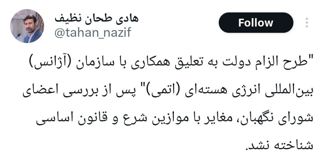 هادی طحان نظیف در گفت و گو اختصاصی با ایرنا گفت: طرح الزام دولت به تعلیق همکاری با آژانس بینالمللی انرژی اتمی توسط اعضای شورای نگهبان مورد بررسی قرار گرفت و خلاف موازین شرع و قانون اساسی شناخته نشد.