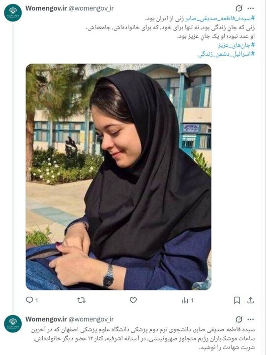 سیده فاطمه صدیقی صابر، دانشجوی ترم دوم پزشکی دانشگاه علوم پزشکی اصفهان که در آخرین ساعات موشکباران رژیم متجاوز صهیونیستی، در آستانه اشرفیه، کنار ۱۲ عضو دیگر خانوادهاش، شربت شهادت را نوشید.