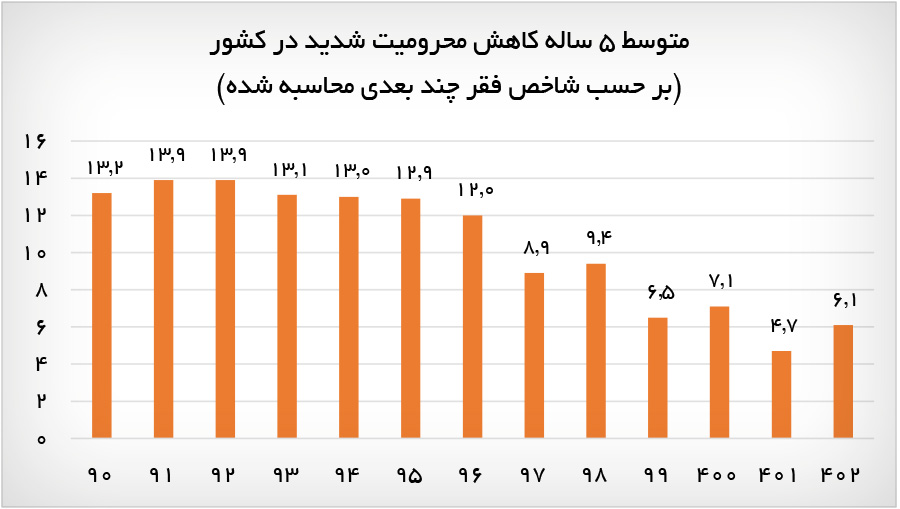 بر این اساس، بررسی وضعیت محرومیت در کشور ما نشان می دهد به رغم کاهش قابل توجه نرخ محرومیت در چند دهه گذشته، هنوز سطحی از محرومیت شدید در برخی مناطق مشاهده می شود. برآوردها نشان می دهد همچنان حدود ۳ درصد از جمعیت کشور در وضعیت محرومیت شدید قرار دارند. در نمودار، متوسط ۵ ساله کاهش محرومیت شدید ایران را برای سال های ۱۳۹۰ تا ۱۴۰۲ نشان می دهد.