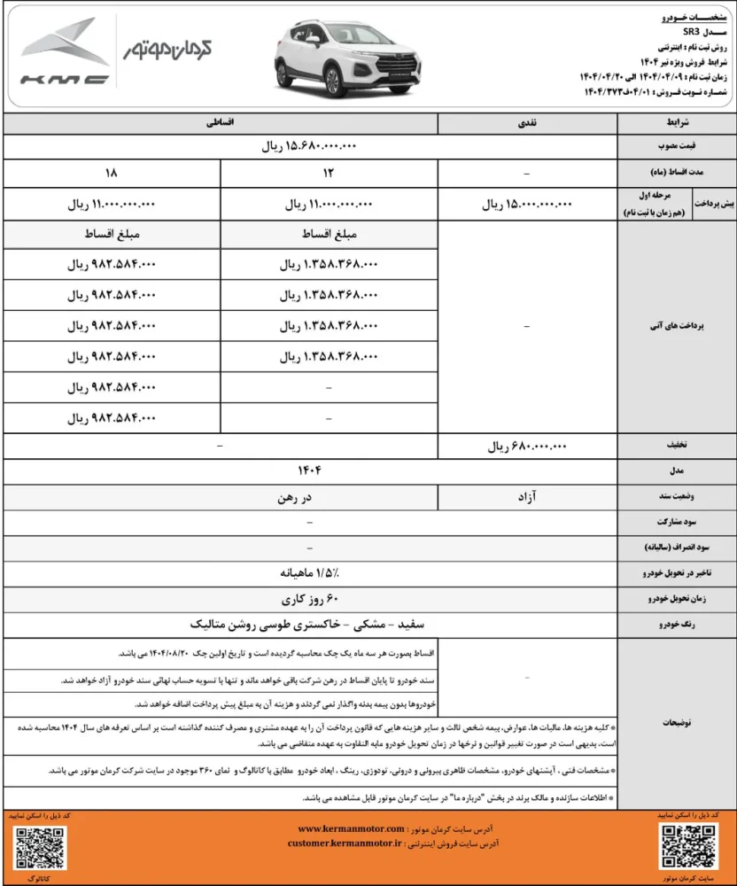 بر اساس اطلاعیه فروش KMC SR3 ، این کراس اوور طی ۶۰ روز کاری به دست مشتریان می رسد. رنگ های سفید، مشکی و خاکستری طوسی روشن متالیک برای این خودرو قابل سفارش است. جریمه تاخیر در تحویل این طرح فروش ۱.۵ درصد به صورت ماهانه است. متقاضیان می توانند از ۹ تیر ۱۴۰۴ تا ۲۰ تیر ۱۴۰۴ نسبت به خرید این خودرو در نمایندگی های کرمان موتور اقدام کنند.