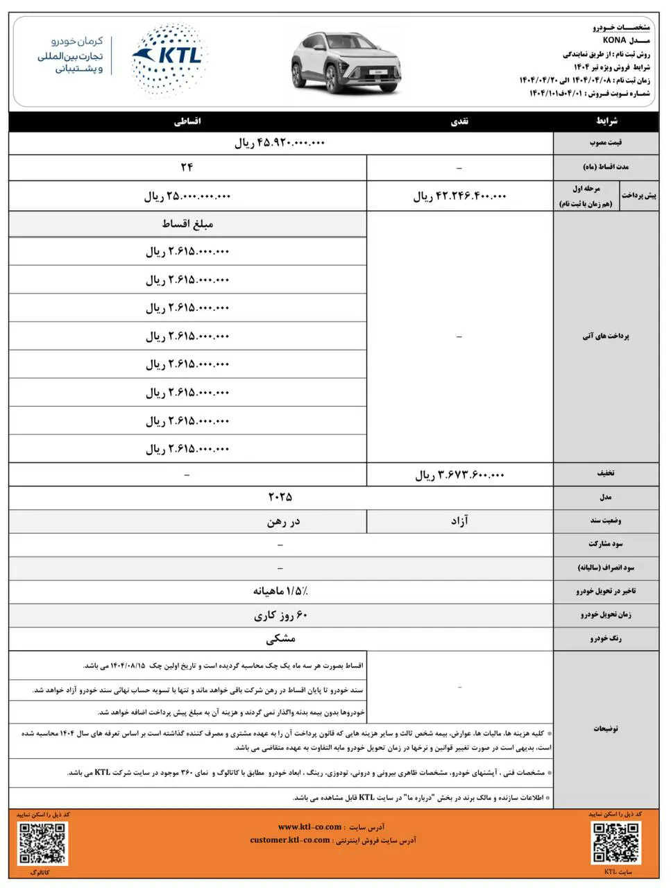/ شرکت KTL کرمان موتور شرایط فروش نقد و اقساط هیوندای کونا مدل ۲۰۲۵ را ویژه تیر ۱۴۰۴ اعلام کرد.
