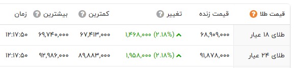 در بازار نرخ هر گرم طلای 18 عیار با 146 هزار تومان افزایش و با نرخ شش میلیون و 890 هزار تومان در بازار طلا معامله شد. سکه امامی با 720 هزار تومان افزایش به 77 میلیون و 710 هزار تومان قیمت گذاری شد. سکه بهار آزادی با 1 میلیون و 215 هزار تومان افزایش به 71 میلیون و 120 هزار تومان رسید. نرخ نیم سکه و ربع سکه به ترتیب 42 میلیون و 900 هزار تومان و 25 میلیون و 300 هزار تومان در تابلو اعلان قیمتها نمایان شد.