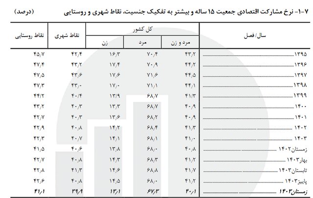 نرخ مشارکت اقتصادی جمعیت ۱۵ ساله و بیشتر به تفکیک جنسیت، نقاط شهری و روستایی در زمستان سال ۱۴۰۳ به صورت کلی به ۴۰.۱ درصد رسید که در مقایسه با پاییز معادل ۱.۱ درصد کاهش یافته است.