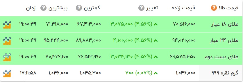 در بازار نرخ هر گرم طلای 18 عیار با 307 هزار تومان افزایش و با نرخ 7 میلیون و 51 هزار تومان در بازار طلا معامله شد. سکه امامی 2 میلیون و 500 هزار تومان افزایش به 79 میلیون و 660 هزار تومان قیمت گذاری شد. سکه بهار آزادی با 1 میلیون و 780 هزار تومان افزایش به 71 میلیون و 790 هزار تومان رسید. نرخ نیم سکه و ربع سکه به ترتیب 43 میلیون و 760 هزار تومان و 25 میلیون و 960 هزار تومان در تابلو اعلان قیمتها نمایان شد.