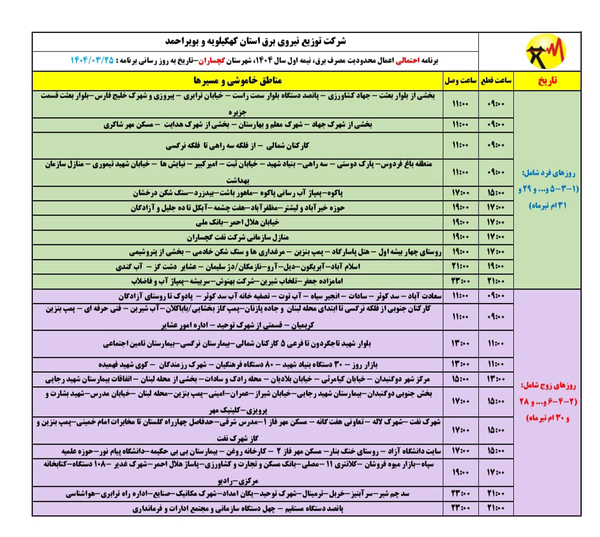 برنامه خاموشیهای احتمالی برق گچساران تا پایان تیرماه
