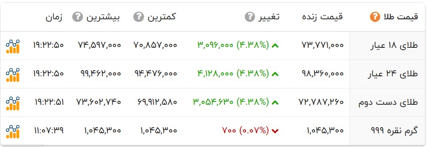 در بازار نرخ هر گرم طلای 18 عیار با 309 هزار تومان افزایش و با نرخ هفت میلیون و 377 هزار تومان در بازار طلا معامله شد. سکه امامی با 4 میلیون تومان افزایش به 83 میلیون و 640 هزار تومان قیمت گذاری شد. سکه بهار آزادی با 3 میلیون و 130 هزار تومان افزایش به 75 میلیون و 10 هزار تومان رسید. نرخ نیم سکه و ربع سکه به ترتیب 45 میلیون و 60 هزار تومان و 26 میلیون و 960 هزار تومان در تابلو اعلان قیمتها نمایان شد.