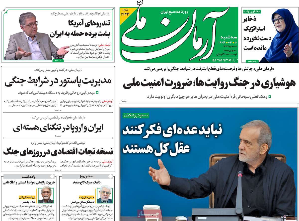 صفحه اول روزنامه آرمان ملی سه‌شنبه ۱۰ تیر