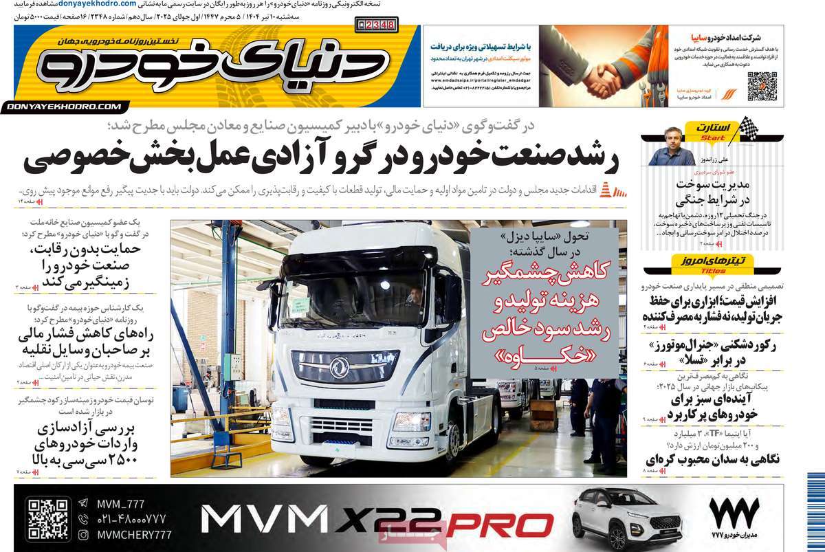 صفحه اول روزنامه دنیای خودرو سه‌شنبه ۱۰ تیر
