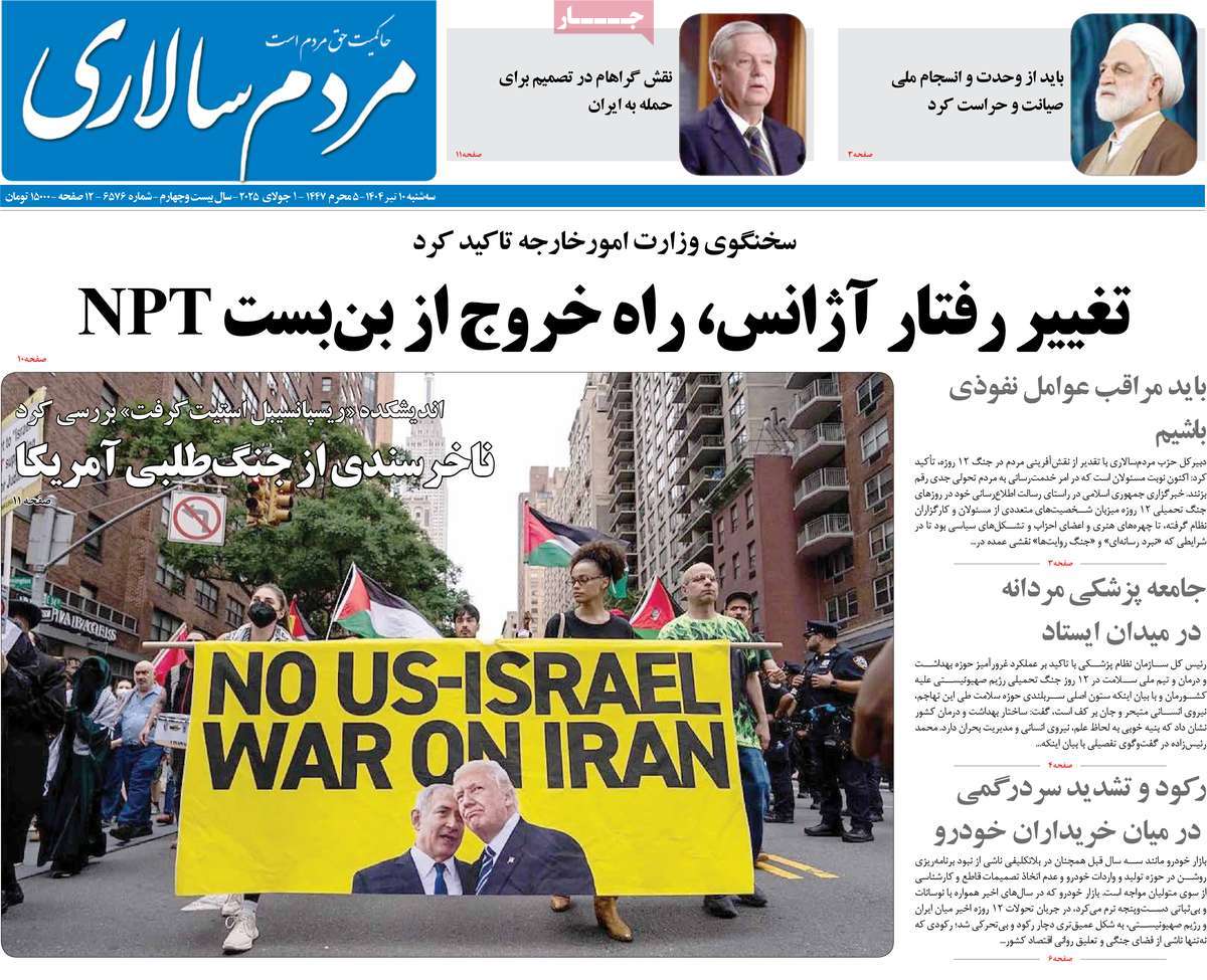 صفحه اول روزنامه مردم سالاری سه‌شنبه ۱۰ تیر