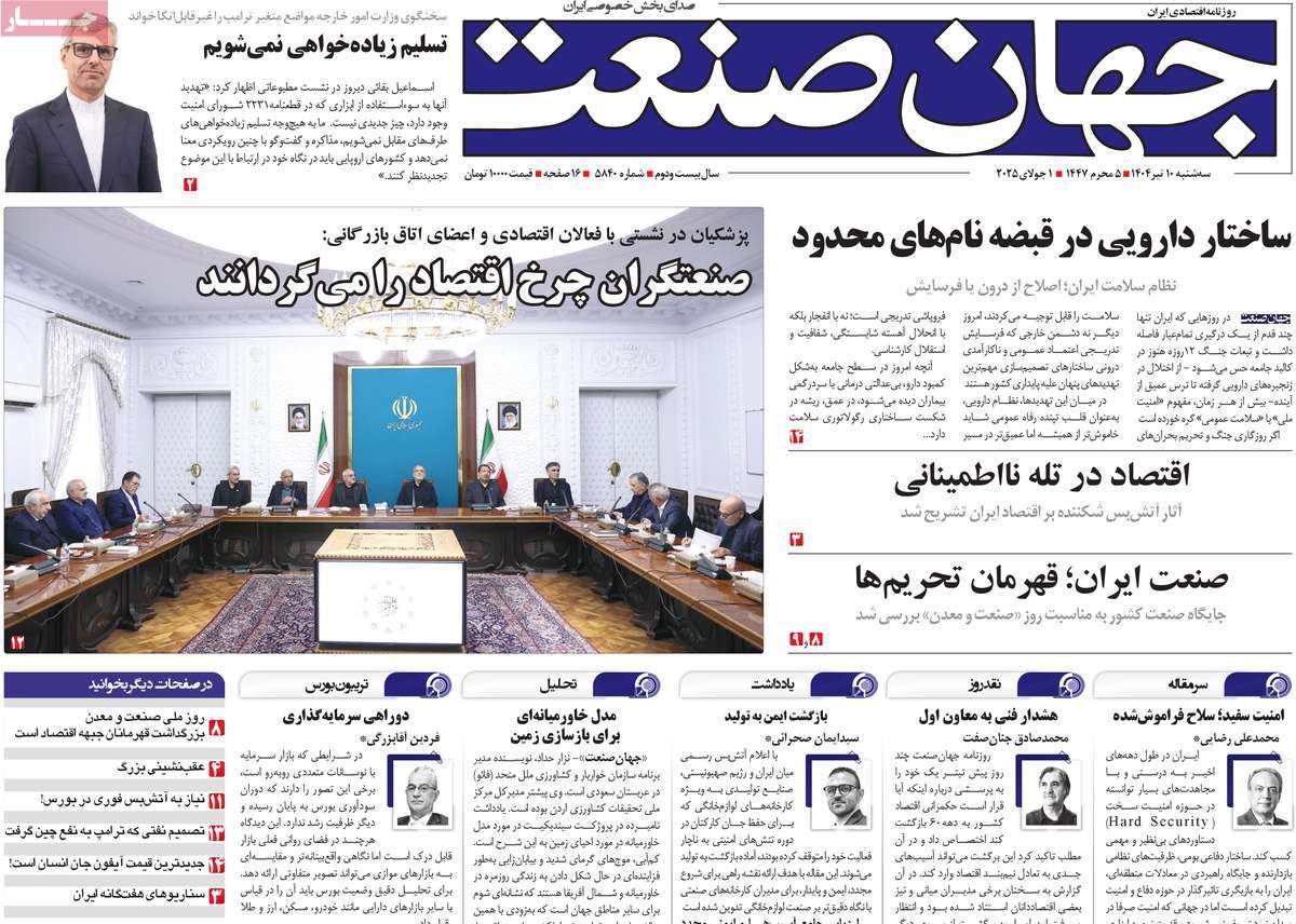 صفحه اول روزنامه جهان صنعت سه‌شنبه ۱۰ تیر