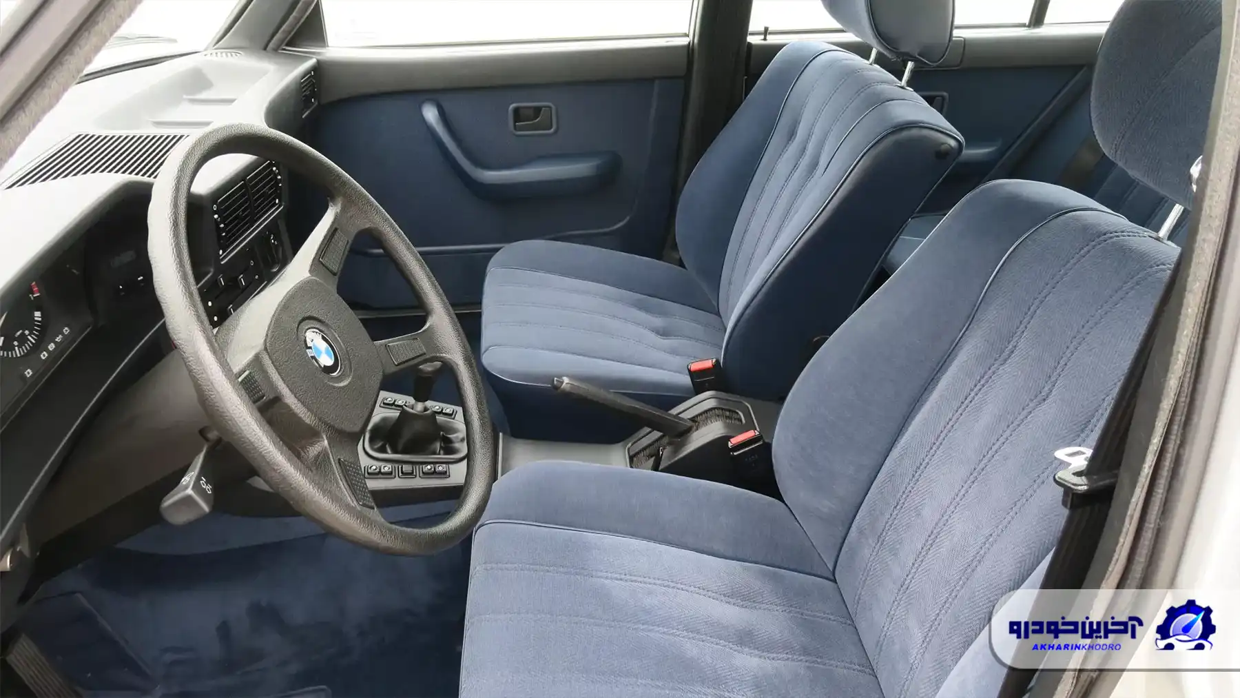در کابین، صندلیها، رودریها و کفپوشها همچنان با پارچه آبی رنگ اصلی کارخانه پوشیده شدهاند. با اینکه در قسمت ستون C لکههایی دیده میشود، باقی بخشها وضعیت بسیار خوبی دارند. سیستم صوتی که پیشتر با بلندگوهای کنوود افترمارکت همراه بود، اکنون با بلندگوهای اصلی ب ام و جایگزین شده تا اصالت خودرو حفظ شود.