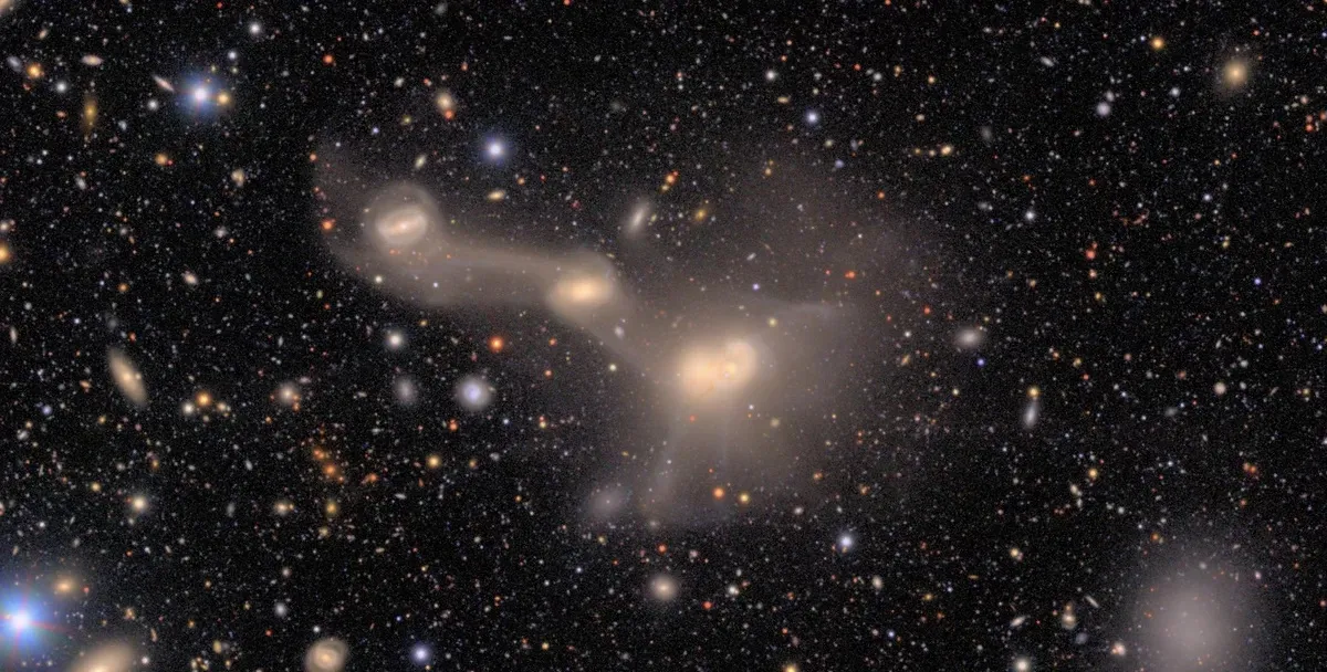 در گوشهی بالا-راست تصویر جدید ورا روبین، سه کهکشان مارپیچی بیش از حد به یکدیگر نزدیک شدهاند. درحالی که هنوز میتوان بازوهای مارپیچی جداگانهای را تشخیص داد، این سه کهکشان درگیر یک کشمکش گرانشی هستند که بهتدریج آنها را به سوی یکیشدن میکشاند؛ ترکیبی آشفته و گازی. پلهایی از ماده بین این کهکشانهای پیچخورده کشیده شدهاند، درحالیکه به آرامی درحال ادغام هستند.