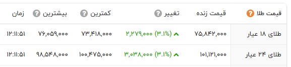 در بازار نرخ هر گرم طلای 18 عیار با 227 هزار تومان افزایش و با نرخ هفت میلیون و 584 هزار تومان در بازار طلا معامله شد. سکه امامی با 3 میلیون و 470 هزار تومان افزایش به 86 میلیون و 980 هزار تومان قیمت گذاری شد. سکه بهار آزادی با 2 میلیون و 580 هزار تومان افزایش به 77 میلیون و 490 هزار تومان رسید. نرخ نیم سکه و ربع سکه به ترتیب 47 میلیون تومان و 28 میلیون تومان در تابلو اعلان قیمتها نمایان شد.