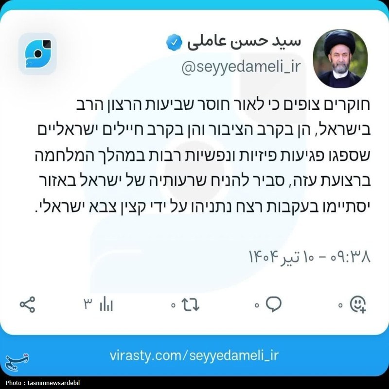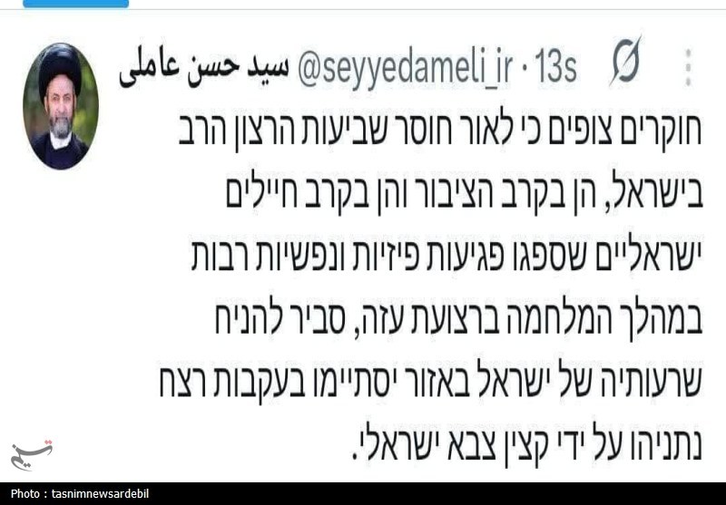 آیتالله سید حسن عاملی، نماینده ولی فقیه در استان و امام جمعه اردبیل در صفحه مجازی خود در شبکههای اجتماعی به زبان عبری نوشت: اهل تحقیق پیشبینی میکنند با توجه به نارضایتی شدید در اسرائیل هم در میان مردم و هم در میان نظامیان اسرائیلی که در غزه بسیار صدمه روحی و جانی دیدهاند، به احتمال قوی شرارتهای اسرائیل در منطقه با ترور نتانیاهو توسط یکی از افسران ارتش اسرائیل به پایان خواهد رسید.