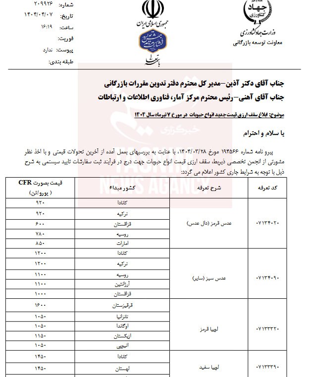 معاونت توسعه بازرگانی وزارت جهادکشاورزی قیمت مصوب جدید 12 قلم از حبوبات وارداتی را برای ثبت سفارش و واردات در فصل تابستان اعلام کرد.