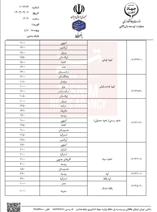 تسنیم/قیمت مصوب ۱۲ قلم از حبوبات وارداتی توسط معاونت توسعه بازرگانی وزارت جهاد کشاورزی اعلام شد.