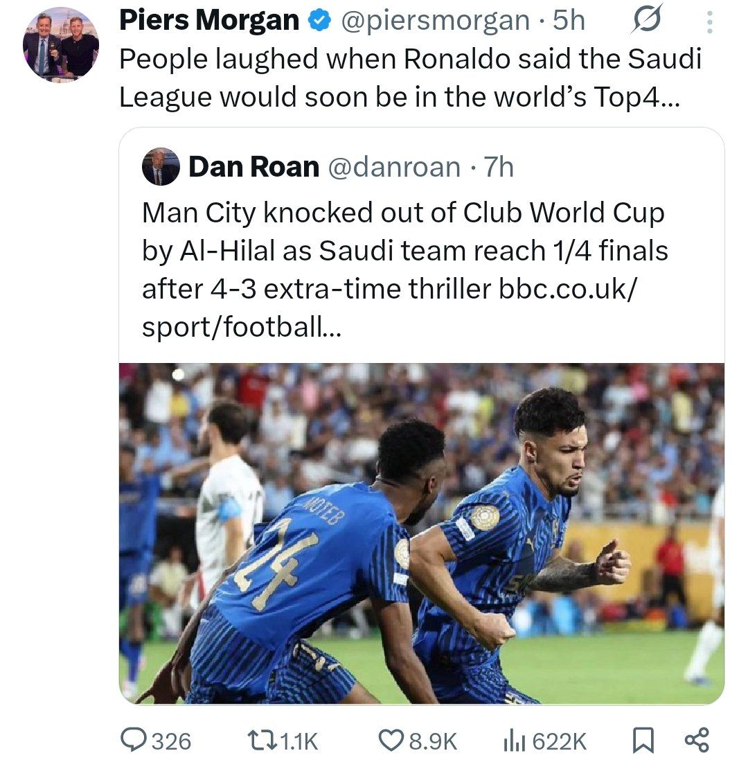 پیرس مورگان با انتشار خبر حذف سیتی، تلویحاً این پیروزی را دلیلی بر صحت ادعای رونالدو دانست. الهلال، تیمی از همان لیگ مورد بحث، موفق شد یکی از بهترین تیمهای اروپا که هر سه بازی مرحله مقدماتی را برده بود، شکست دهد؛ آن هم در یک دیدار جدی و رسمی.