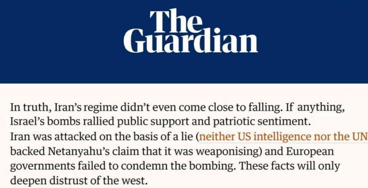 صدا و سیما/ روزنامه انگلیسی گاردین نوشته است: ایران بر پایه یک دروغ مورد حمله قرار گرفت: اینکه ایران داشت برنامه هستهای خود را به یک برنامه نظامی تبدیل میکرد. ادعایی که نه سازمانهای اطلاعاتی آمریکا و نه سازمان ملل آن را تأیید نمیکردند؛ ولی با این حال، دولتهای اروپایی حاضر نشدند که بمباران ایران را محکوم کنند. این واقعیات فقط بیاعتمادی به غرب را عمیقتر میکند.