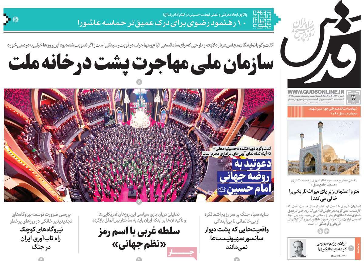 صفحه اول روزنامه قدس چهارشنبه ۱۱ تیر