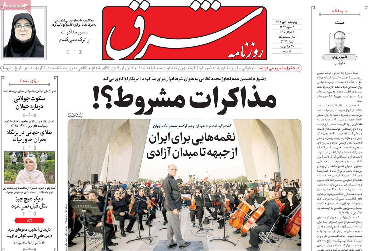 صفحه اول روزنامه شرق چهارشنبه ۱۱ تیر