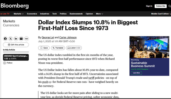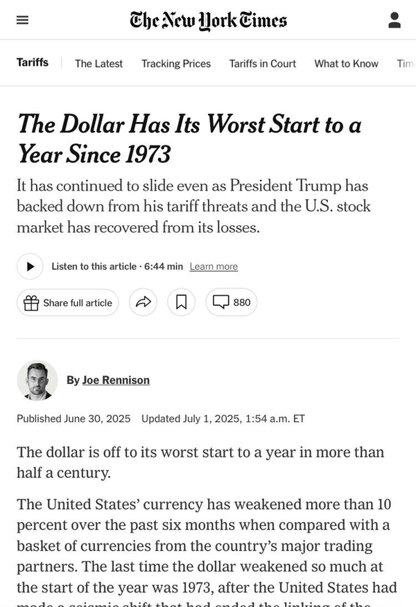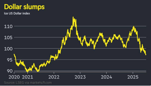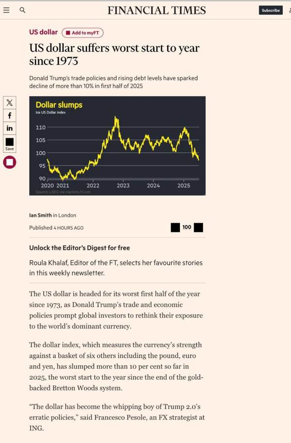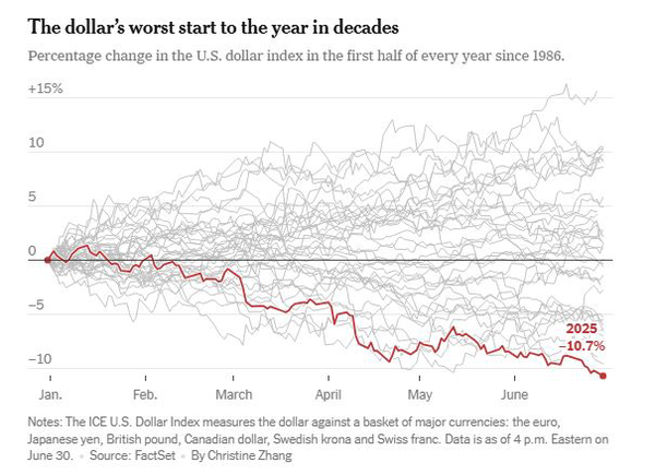 روزنامه فایننشال تایمز طی گزارشی نوشته، دلار آمریکا در نیمه نخست سال ۲۰۲۵ بدترین عملکرد خود از سال ۱۹۷۳ را ثبت کرده است چراکه سیاستهای تجاری و اقتصادی دونالد ترامپ باعث شده سرمایهگذاران جهانی نسبت به نگهداری این ارز مسلط جهان تجدیدنظر کنند.