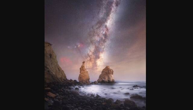 این عکس که در ژوئن ۲۰۲۴ از منطقه اوتاگو در نیوزیلند گرفته شده است، هسته مرکزی درخشان کهکشان راه شیری را در میان دو صخره زیبا و مخروطیشکل نشان میدهد.