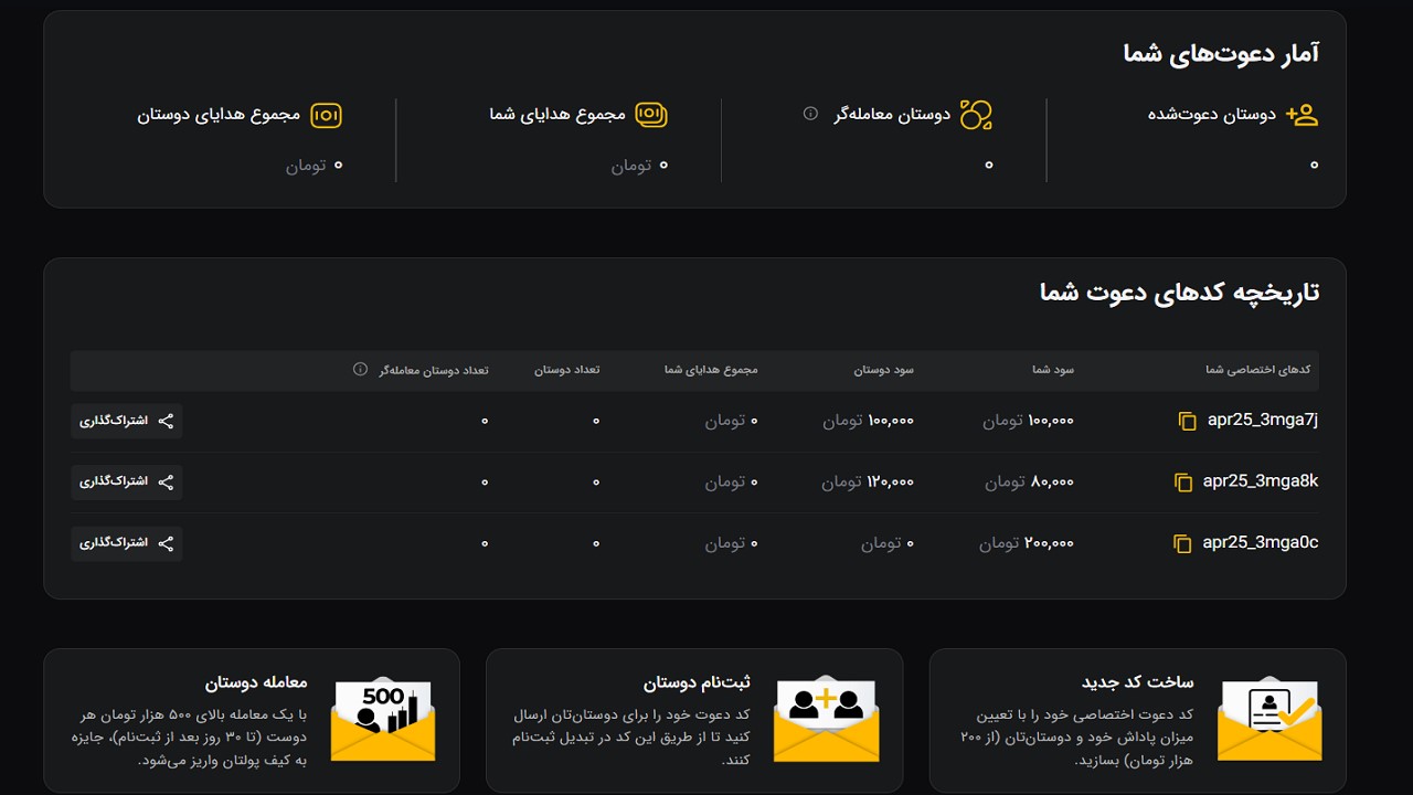 ⏺ بدون محدودیت در تعداد دعوت: میتوانید کد خود را برای هر تعداد از دوستانتان ارسال کنید. هر دعوت موفق، یعنی ۲۰۰ هزار تومان دیگر!