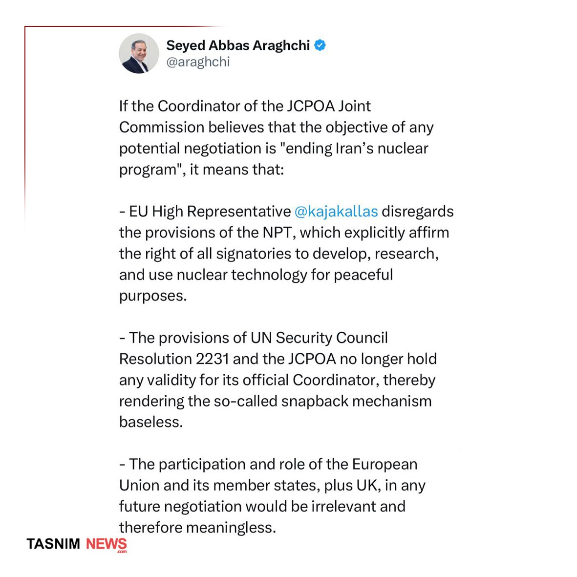 خانم کایا کالاس نماینده عالی اتحادیه اروپا، مفاد معاهده عدم اشاعه (NPT) را که صراحتاً حق همه کشورهای عضو برای توسعه، تحقیق و استفاده از فناوری هستهای برای اهداف صلحآمیز را تأیید میکند، نادیده میگیرد.