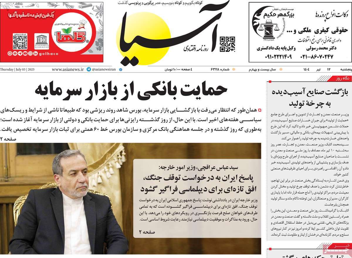 صفحه اول روزنامه آسیا پنجشنبه ۱۲ تیر