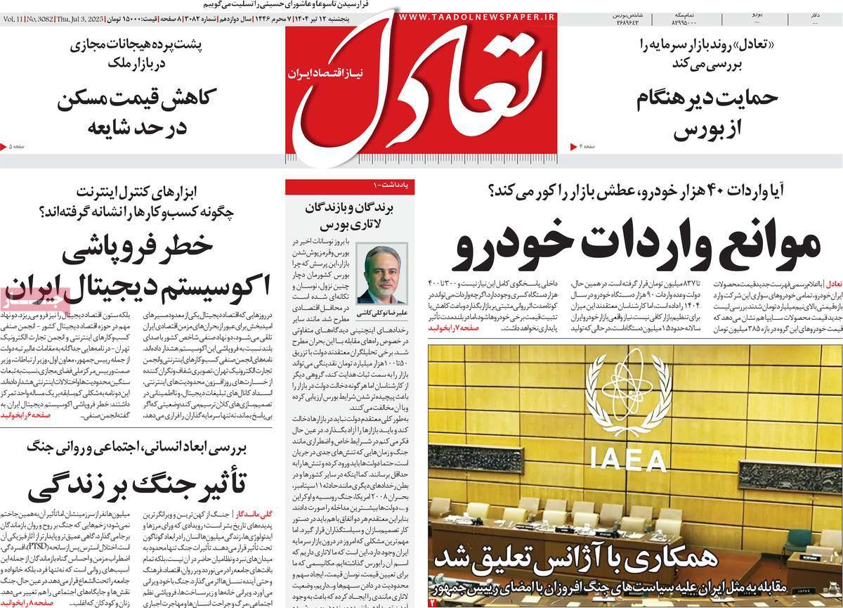 صفحه اول روزنامه تعادل پنجشنبه ۱۲ تیر