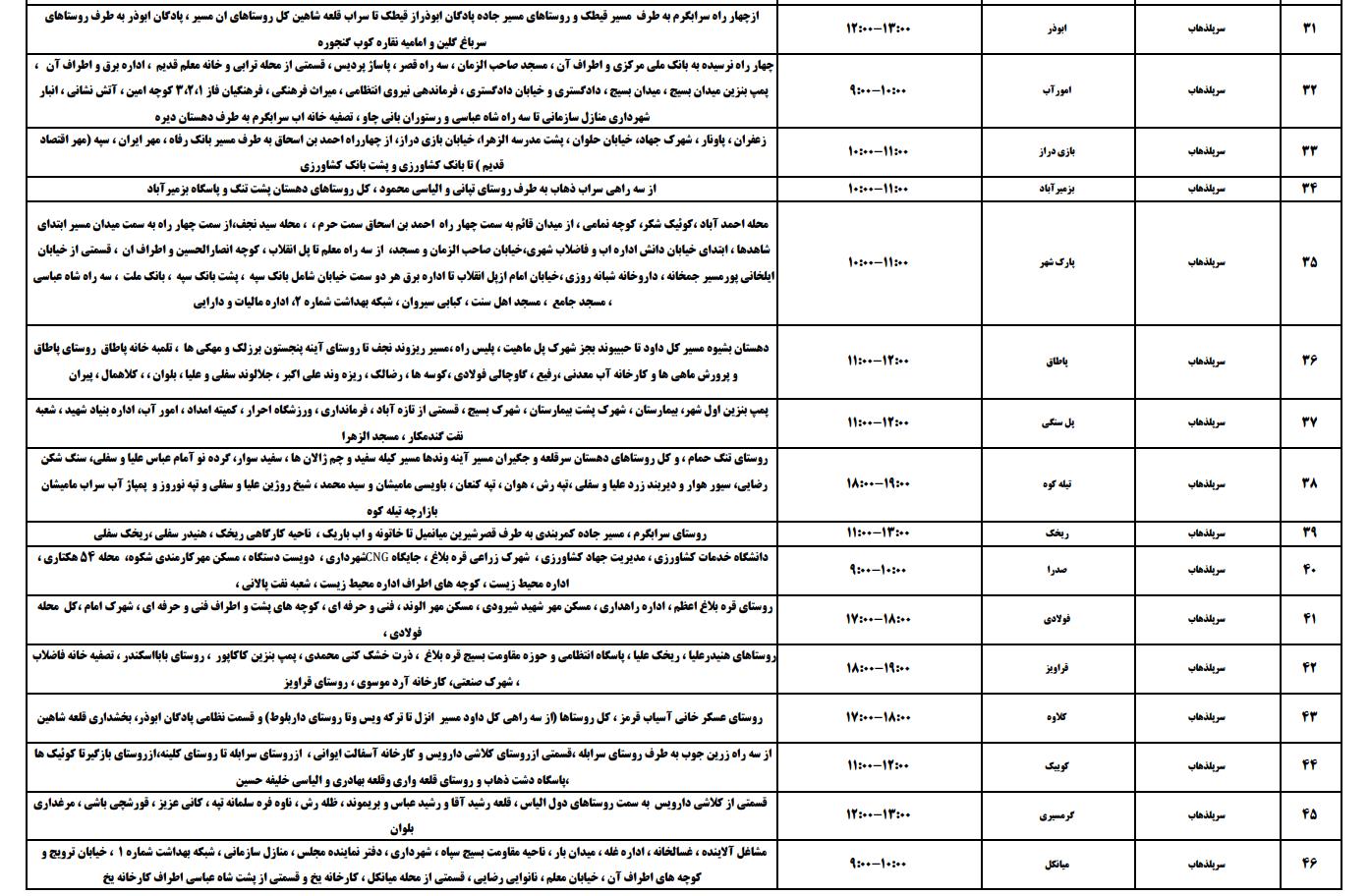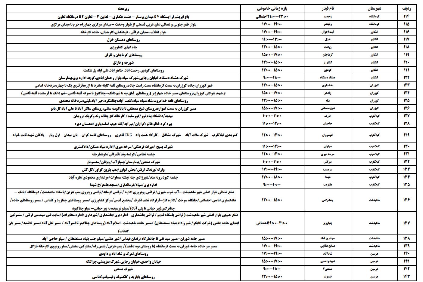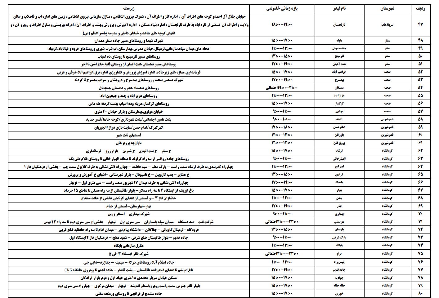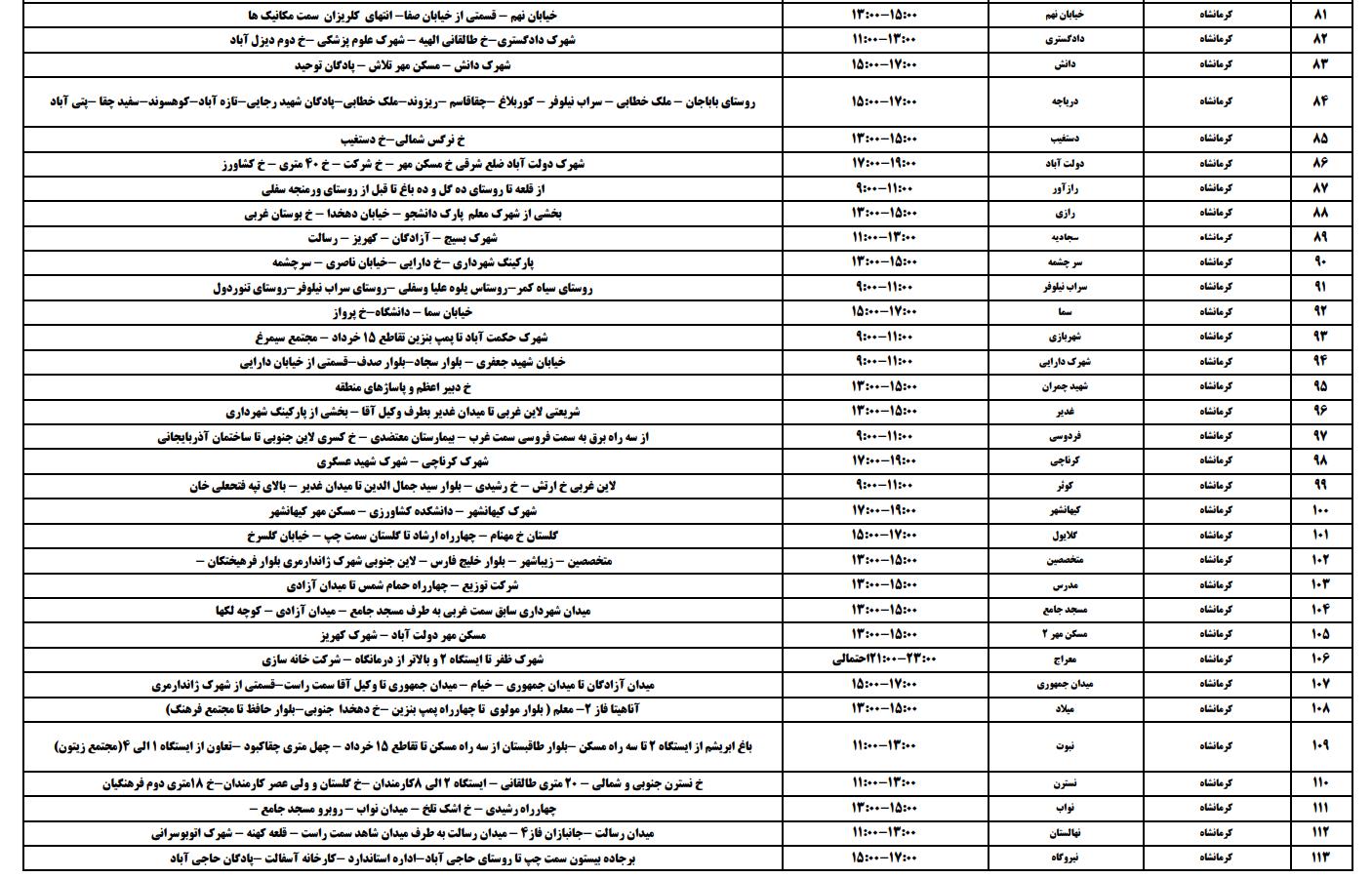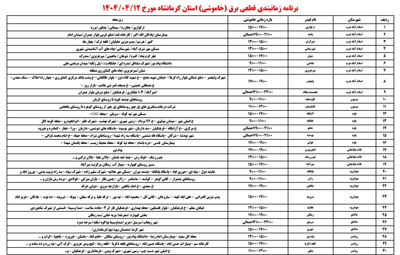 جدول زمانی قطع برق استان کرمانشاه در روز ۱۲ تیر